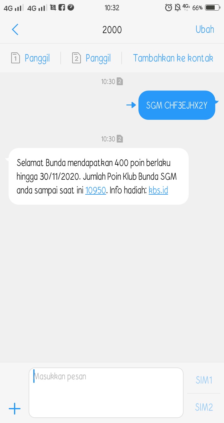 | Contoh sms pengumpulan poin dan balasan dari klub bunda SGM |