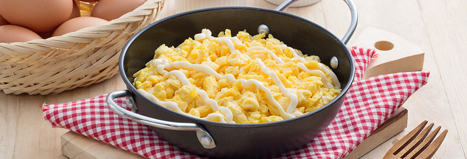 2. Panaskan Blue Band di dalam wajan anti lengket di atas api sedang. Lalu tuangkan telur, diamkan sejenak, masak orang arik hingga matang dan angkat.