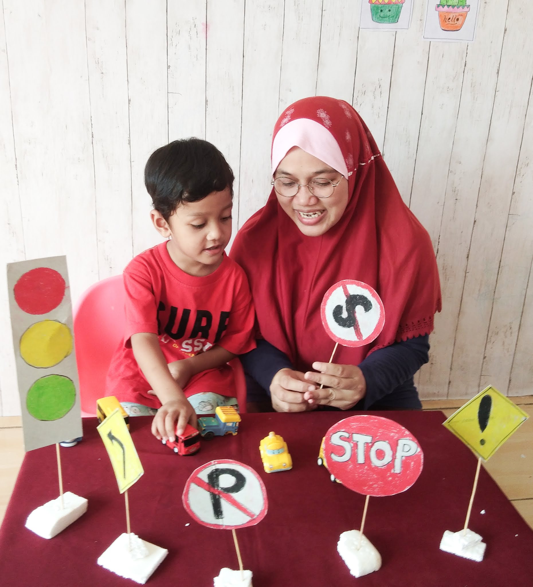 Salah satu kegiatan seru yang belum lama ini saya lakukan adalah bermain peran. Kita bisa ajak si Kecil bermain peran menjadi pilot, guru, atau arsitek! Bermain Peran menjadi profesi tertentu dapat melatih Potensi  prestasinya yaitu Berpikir Kreatif, Tumbuh Kembang, dan Percaya Diri si Kecil. Nah saya dan ghazy bermain peran menjadi polisi yang mengatur lalu lintas. Saya pun membuat perlengkapan pendukung seperti rambu-rambu lalu lintas dari kotak SGM. Seru sekali, ghazy pun bisa belajar mengenal rambu-rambu lalu lintas.
