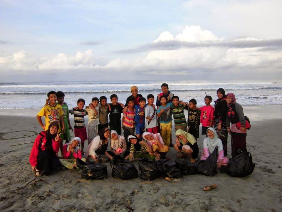 | saya , guru, dan murid SD Mahira melakukan aksi pungut sampah di pantai |