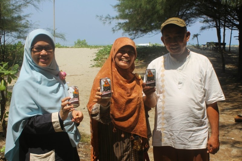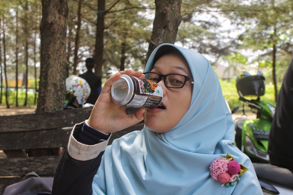 Setelah puas menikmati pantai, saya kehausan dan merasa tenggorokan agak panas. Untunglah di tas sedia Liang Teh Cap Panda, minuman cincau yang bisa meredakan panas dalam. Kebetulan ada Ibu Linda dan Pak Novian yang juga saya kasih liang teh cap panda.