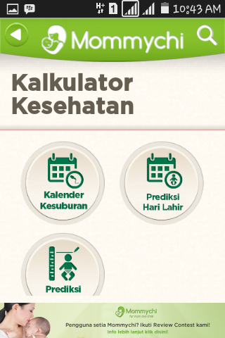2. Kalkulator Kesehatan yang terdiri dari kalender kesuburan untuk mengetahui masa subur mommy, predeksi haril lahir buah hati yang dihitung dari hari pertama periode haid terakhir, juga prediksi tinggi anak untuk anak usia 2 tahun ke atas