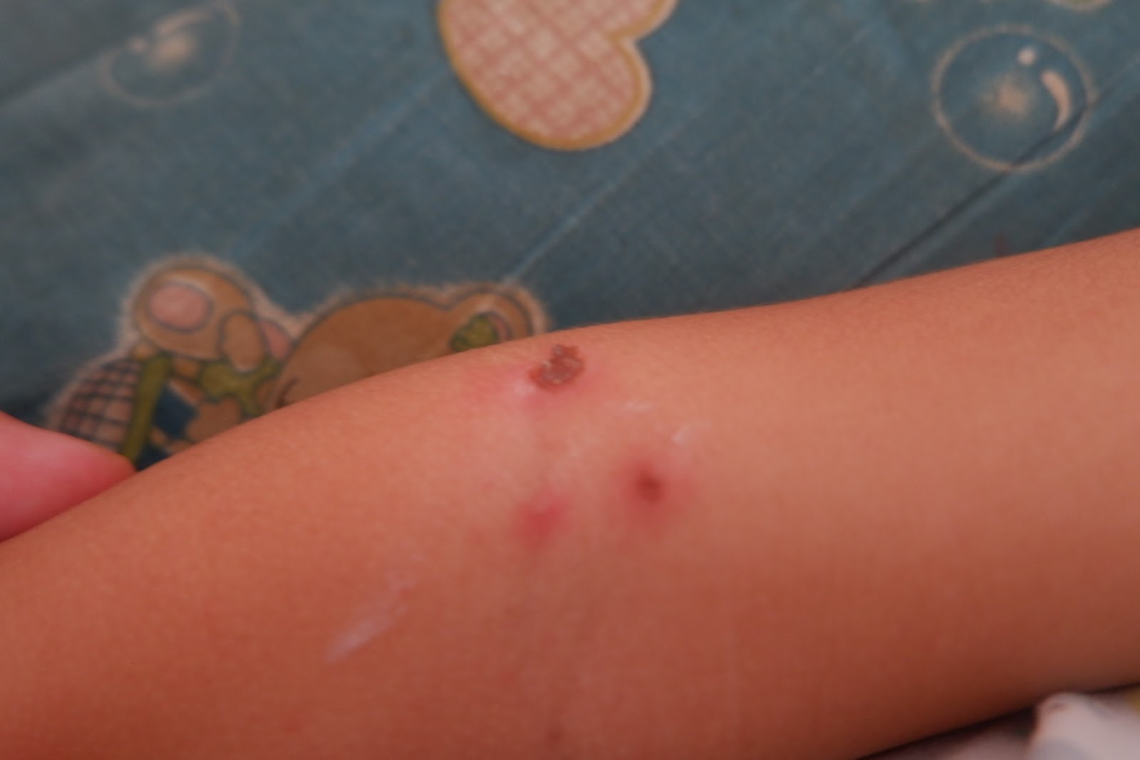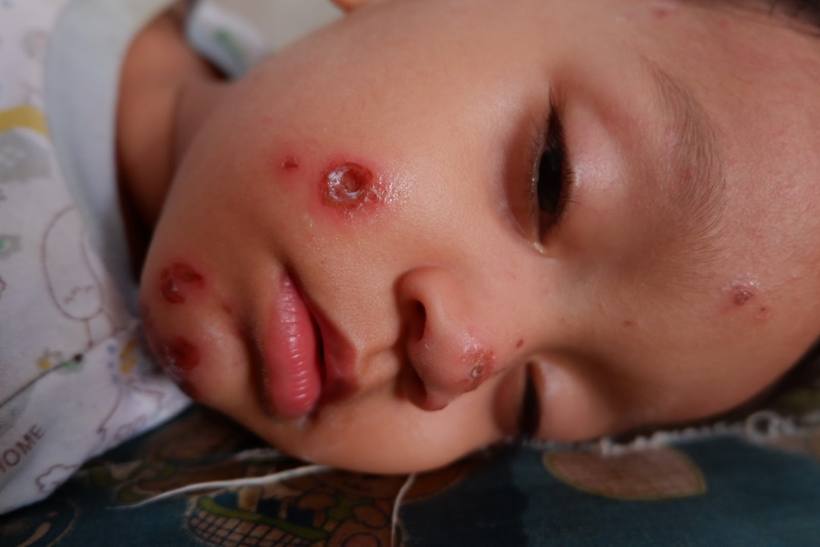 Lalu entah kenapa tiba-tiba dibagian hidup dan pipinya muncul luka dengan pinggiran merah. Awalnya luka itu kecil namun lama-lama membesar. Di bagian lain seperti dagu dan lipatan lengan ada bentolan merah berair yang mudah sekali pecah lalu menjadi luka seperti di muka. Saya tentu saja cemas melihat luka di wajahnya itu seperti di sulut api rokok. Bahkan bagian pipi seperti membuat lubang besar. Makin khawatir karena setiap menjelang malam suhu badannya mendadak tinggi dan ghazy gelisah sekali, saya harus begadang untuk mengompres dan menenangkannya.