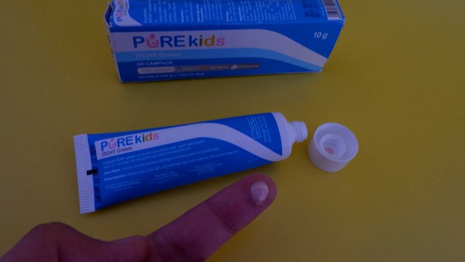 Biasanya saya menaburkan bedak supaya kulitnya terasa dingin. Namun bedak hanya meredakan sesaat saja, jika bedak mulai memudar maka gatal akan datang kembali sepanjang malam. Hingga akhirnya saya mencoba menggunakan Pure Kids Itchy Cream yang direkomendasikan oleh teman.
