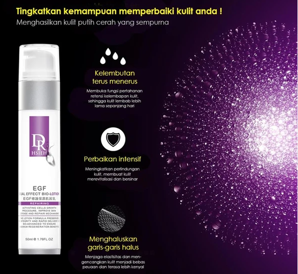 EGF Dual Effect Bio-Lotion mampu mengembalikan dan mengaktifkan kondisi sel kulit, menjadikannya lebih kencang, meratakan garis halus, memastikan kondisi kulit tetap lembab, cerah dan elesatis.
