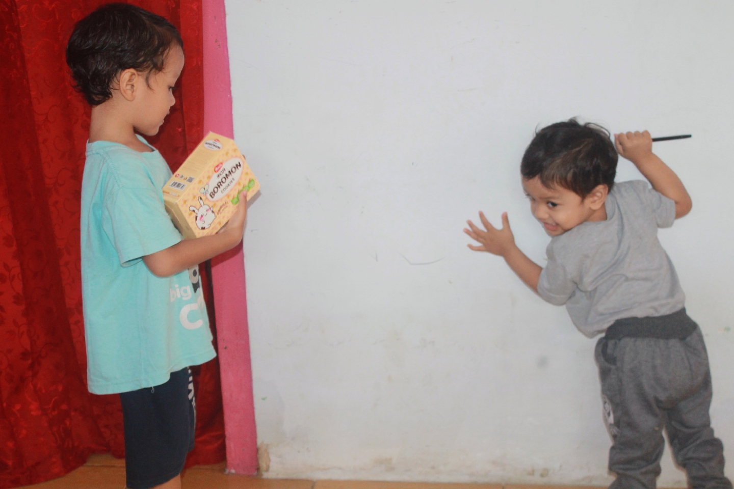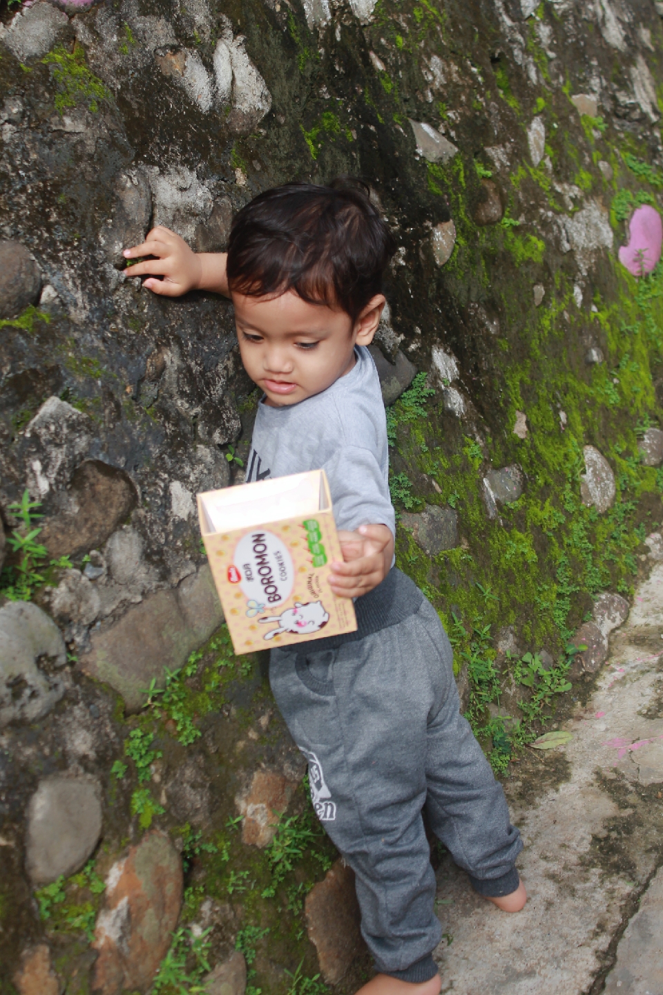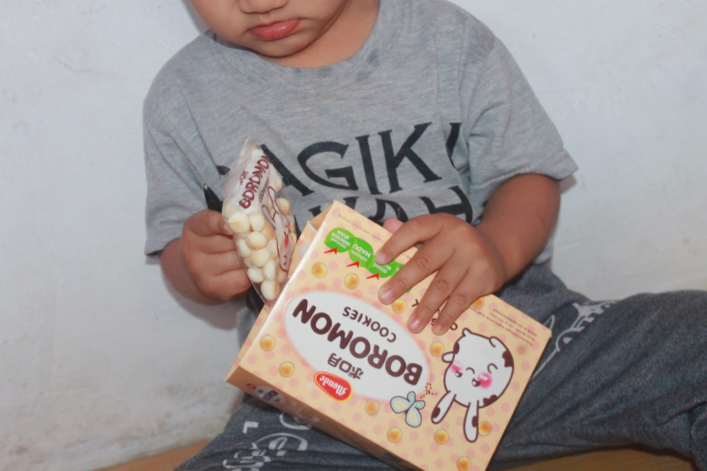 Anak-anak biasanya senang melihat kotak yang dalamnya bisa berbunyi. Saat saya memberikannya boromon cookies, ghazy mengguncang isi dalamnya dan muncul bunyi yang menarik. Saya minta ghazy untuk mengeluarkan satu persatu isinya, nah kegiatan ini bisa lama loh dia kerjakan. Dikeluarkan-Dimasukkan hingga ia bosan dan ingin menggigit plastik cookies >.<