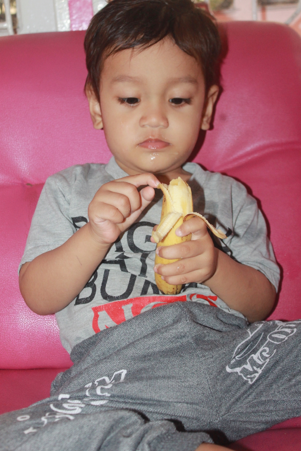 Ghazy doyan banget sama pisang. Sekarang saya sering memintanya untuk mengupas kulit pisang sendiri. Nah, ini bisa jadi stimulasi sederhana loh untuk merangsang kemampuan motorik halusnya. Tangan-mata-dan otak akan saling bekerja sama agar pisang bisa dikupas dengan sempurna. Tara, setelah ia berhasil membukanya ghazy semangat sekali menghabiskan pisangnya. Hehee..