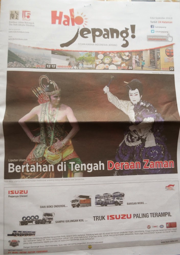 Halo Jepang, Titian Kabar Indonesia-Jepang yang dikirim ke saya itu edisi september 2014 yang terdiri dari 24 halaman. Sesuai dengan judulnya, isi tabloid ini memang tentang jepang. Mulai dari liputan utamanya yang mengulas seni pertunjukan tradisional kabuki layaknya wayang orang di Indonesia, Peristiwa, Warta Niaga, Opini, Figur, Inspirasi, Pendidikan, Budaya, hingga info event dan restoran yang ada di Jepang dan indonesia.